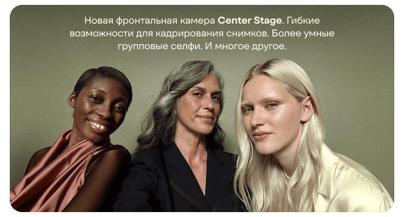 Новая 18-мегапиксельная фронтальная камера с функцией Center Stage полностью изменяет кадр для селфи и видеозвонков. Она предлагает новые гибкие способы кадрирования фотографий и видео. Простым касанием можно расширить поле зрения, а вид можно повернуть с портретного на ландшафтный, не перемещая iPhone. Камера интеллектуально определяет, когда в кадр входит больше людей, и автоматически расширяет кадр, чтобы все поместились на фотографии.