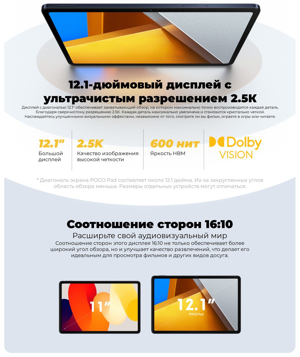 Начнем с того, что расскажем вам о захватывающем 12.1-дюймовом дисплее POCO Pad с широким соотношением сторон 16:10. Он также обеспечивает четкое, плавное и разборчивое изображение даже при ярком солнечном свете с разрешением 2.5 K, настраиваемой частотой обновления до 120 Гц, максимальным уровнем яркости и высоким разрешением. 600 нит и совместимость с Dolby Vision.