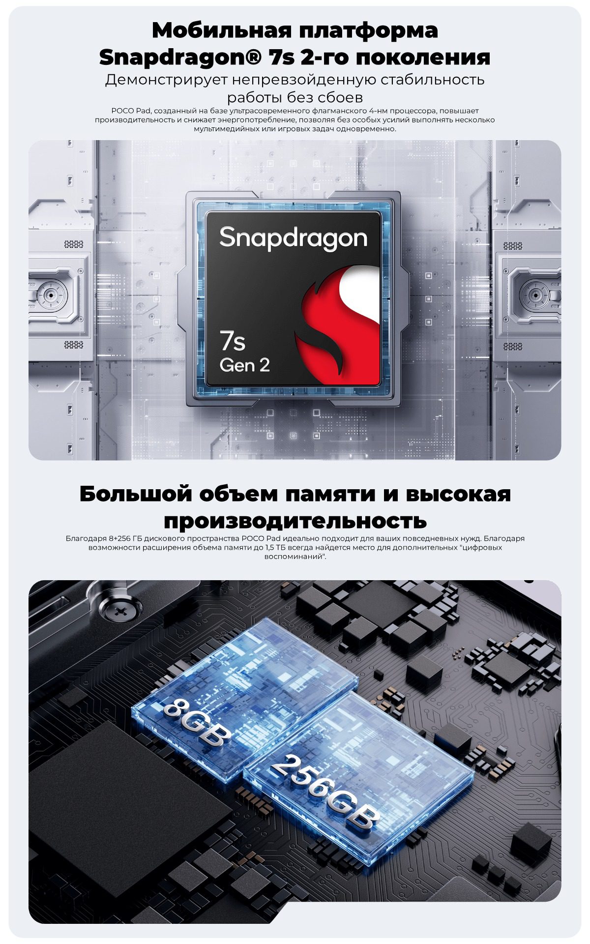 Обладая исключительным технологическим процессом 4 нм, мощная мобильная платформа Qualcomm Snapdragon 7s Gen 2 планшета POCO Pad обеспечивает как высокую производительность, так и низкое энергопотребление. Он, в свою очередь, поддерживается оперативной памятью LPDDR4X объемом 8 ГБ и ПЗУ UFS 2.2 объемом 256 ГБ (последнее можно расширить с помощью карты microSD емкостью до 1.5 ТБ).
