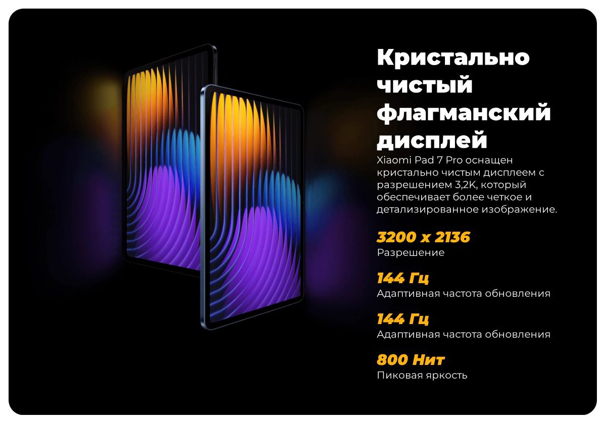 Когда дело доходит до дизайна и материалов, Xiaomi не пожалела средств на создание Xiaomi Pad 7 Pro. Планшет оснащен 11.2-дюймовым ЖК-экраном IPS с разрешением 3200 x 2136 (UHD), обеспечивающим кристально чистое изображение для действительно захватывающего просмотра. Благодаря частоте обновления 144 Гц и максимальной яркости 800 кд/м², Xiaomi Pad 7 Pro обеспечивает яркие цвета и четкие детали, благодаря которым ваш контент оживает. Кроме того, планшет поддерживает HDR10 для динамической контрастности и ярких цветов.