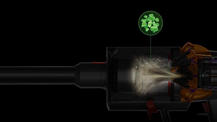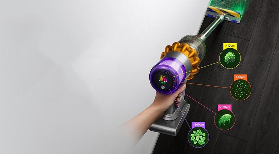 Пылесос Dyson V15 с лазерным лучом подсвечивает мельчайшую пыль, которую не видно невооруженным взглядом. Он борется с любыми загрязнениями на полу, стенах, в щелях, ворсе ковра. Информативный ЖК-дисплей передает информацию о работе в реальном времени.
