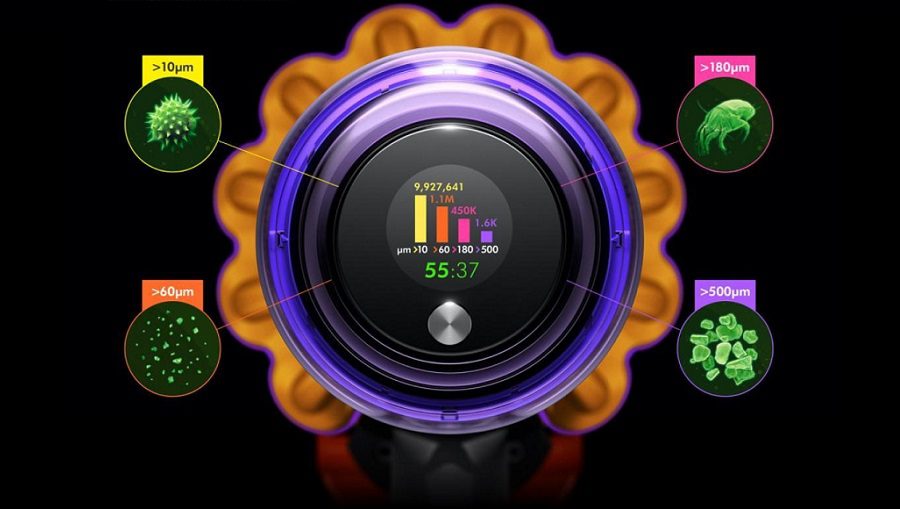 8 000 раз в секунду отслеживается работа пылесоса в реальном времени. Вся информация отображается на дисплее, время указывается в секундах. На дисплее можно увидеть советы по обслуживанию, информацию о заряде батареи и мощности.