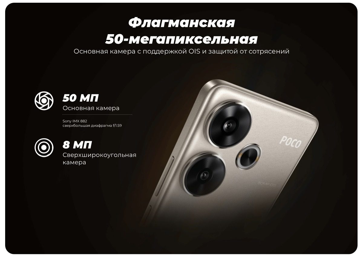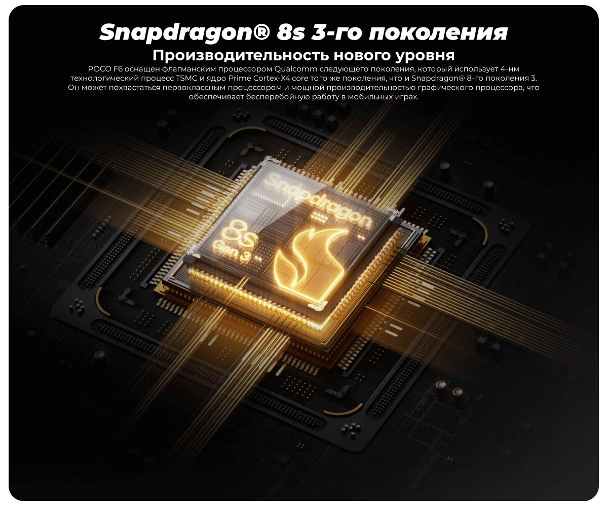 Смартфон Poco F6 - это компактное и мощное устройство. Он оснащен процессором Snapdragon 8s Gen 3, 12 ГБ оперативной памяти LPDDR5X и 512 ГБ встроенной памяти UFS 4.0. За охлаждение отвечает технология LiquidCool 4.0 с IceLoop. На передней панели расположен 6,67-дюймовый AMOLED-дисплей с разрешением 1,5K и фронтальная камера на 20 Мп с функцией интеллектуального распознавания. Корпус смартфона лёгкий и компактный, с футуристичным дизайном и треугольным модулем камеры. Основная камера имеет разрешение 50 Мп и сенсор Sony IMX882 со сверхбольшой диафрагмой f/1.59. Аккумулятор ёмкостью 5000 мАч поддерживает быструю зарядку мощностью 90 Вт.