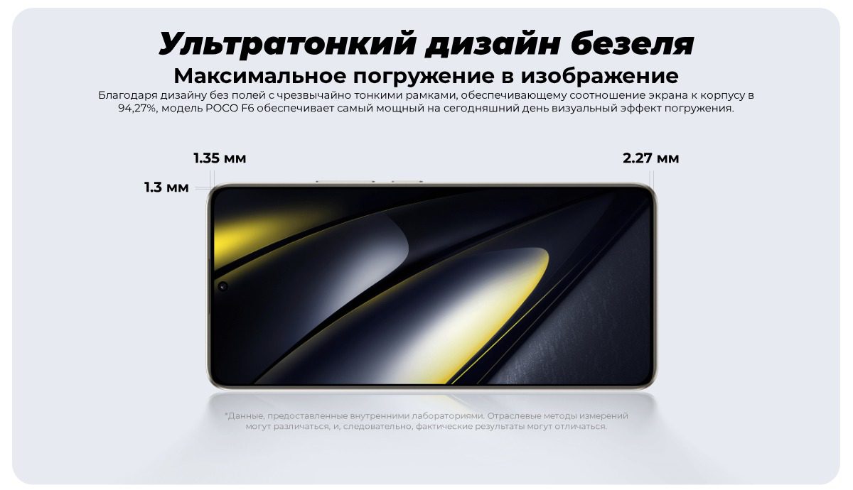 Дизайн смартфона POCO F6 отличается новой футуристической эстетикой. Толщина корпуса составляет всего 7.8 миллиметра, вес — 179 грамм. Благодаря четырем изогнутым краям задней панели, треугольному модулю камеры со вспышкой Halo и трем вариантам цветового оформления, смартфон выглядит стильно и современно. Динамические световые эффекты и удобная форма обеспечивают комфортное использование устройства.